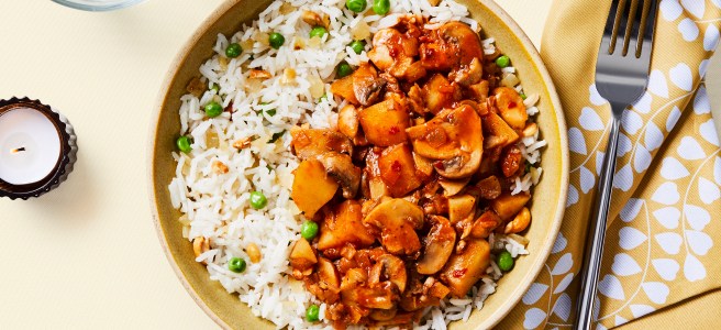 Vegan Mushroom & Potato Curry Bowls (with Pea-Studded Rice)